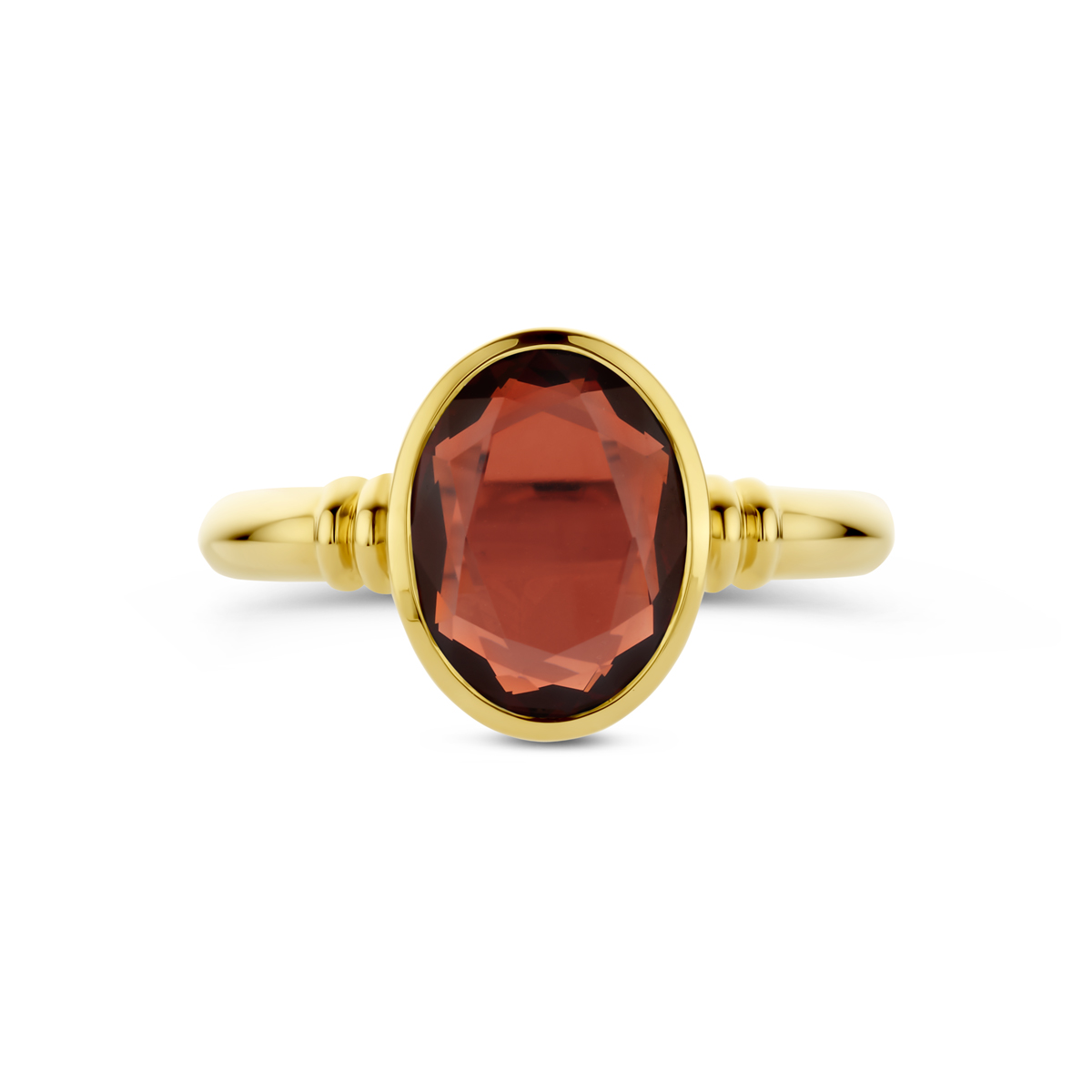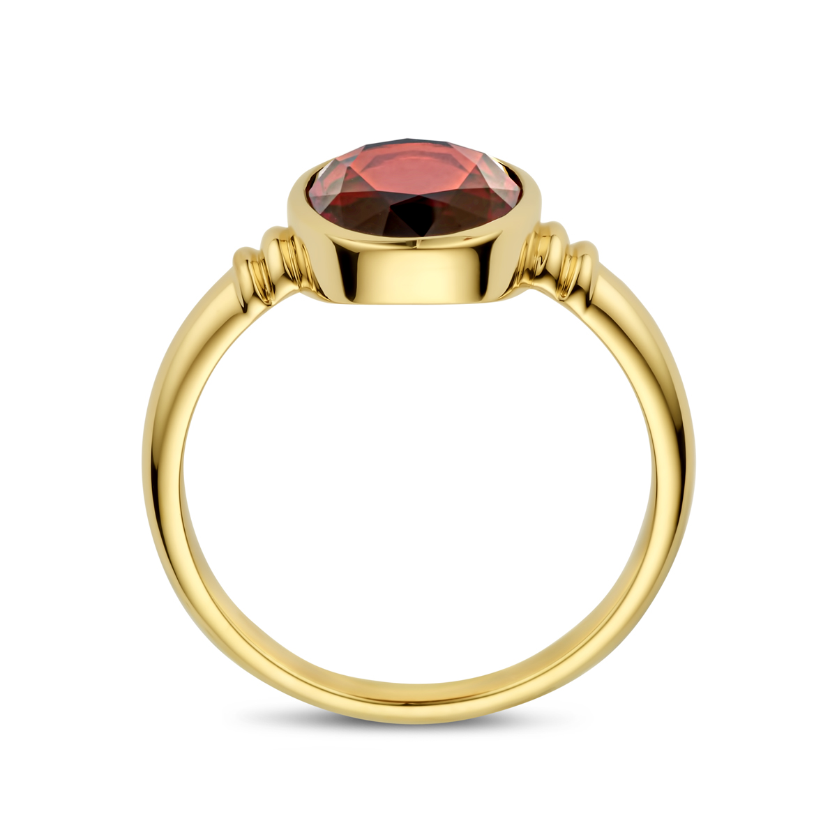 14k Geelgouden ring uitgevoerd met granaat. De ring heeft maat 15.