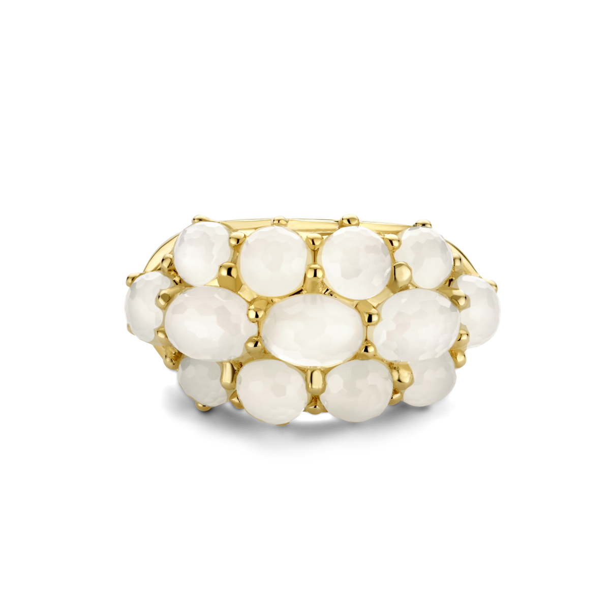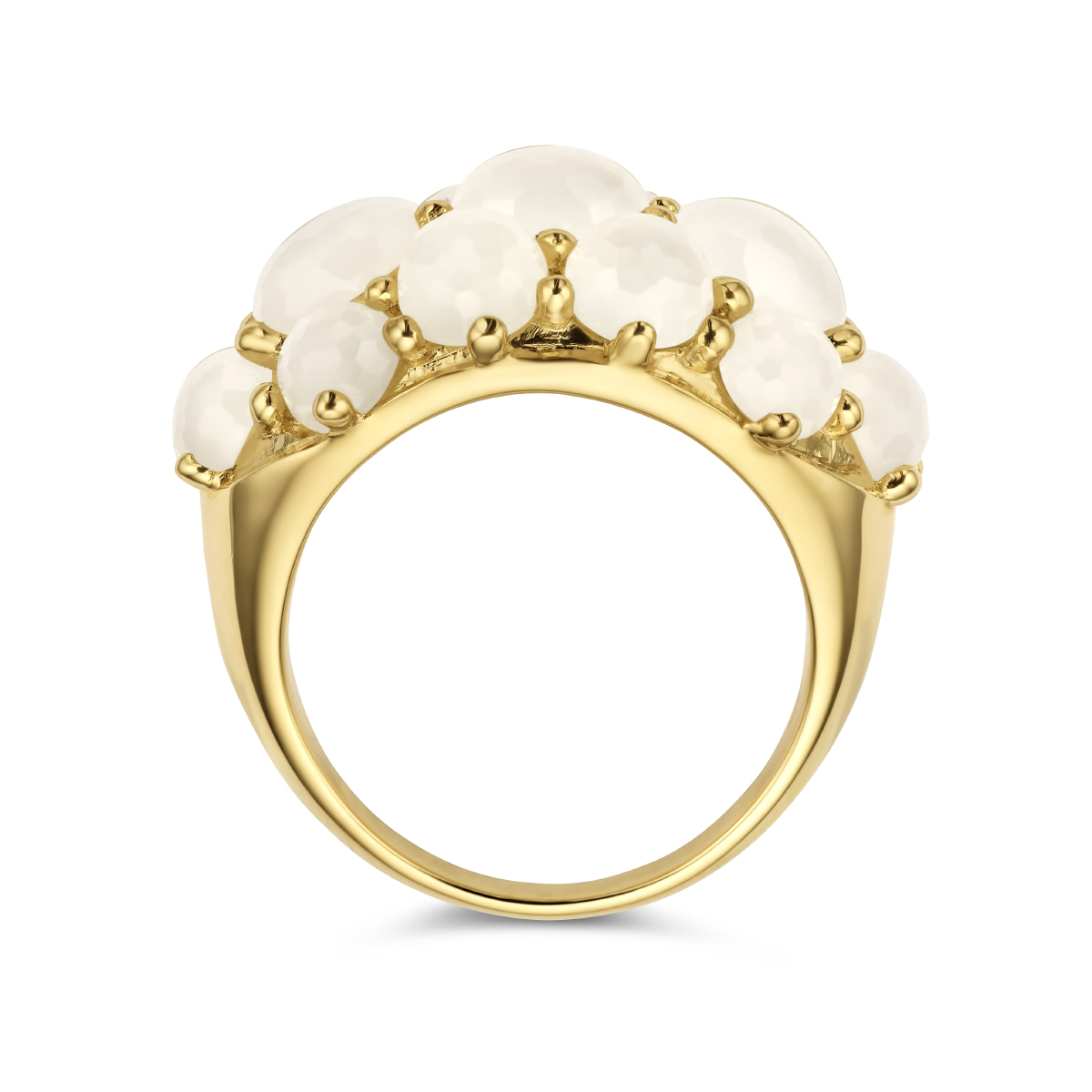 14k Geelgouden ring uitgevoerd met een witte maanstenen. De maanstenen hebben een totaal steengewicht van 6.62ct.