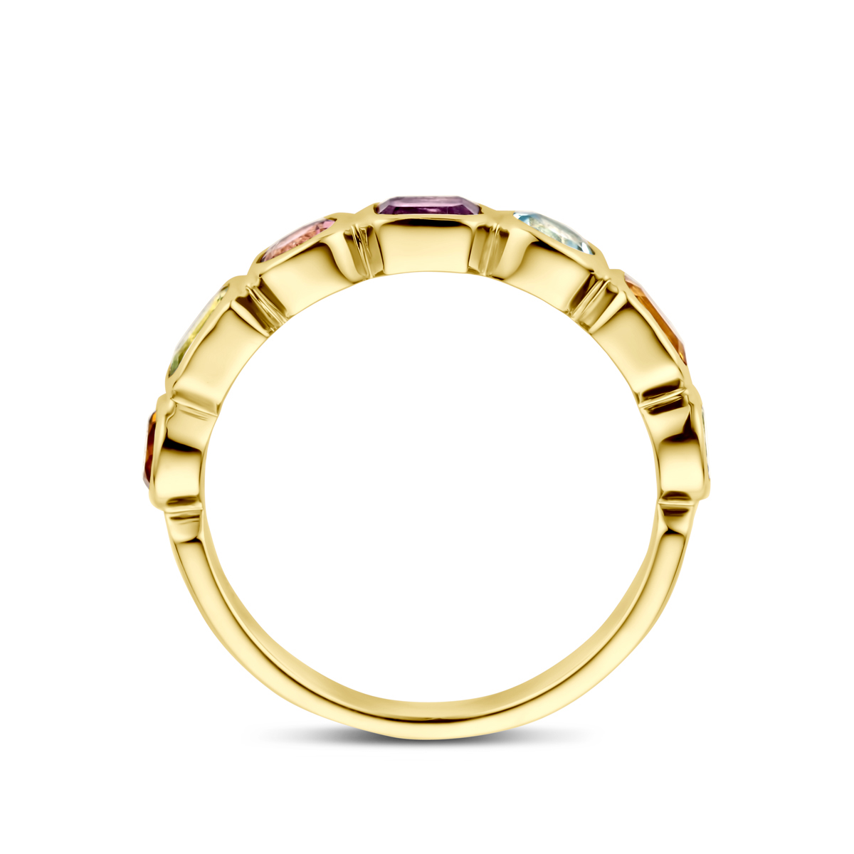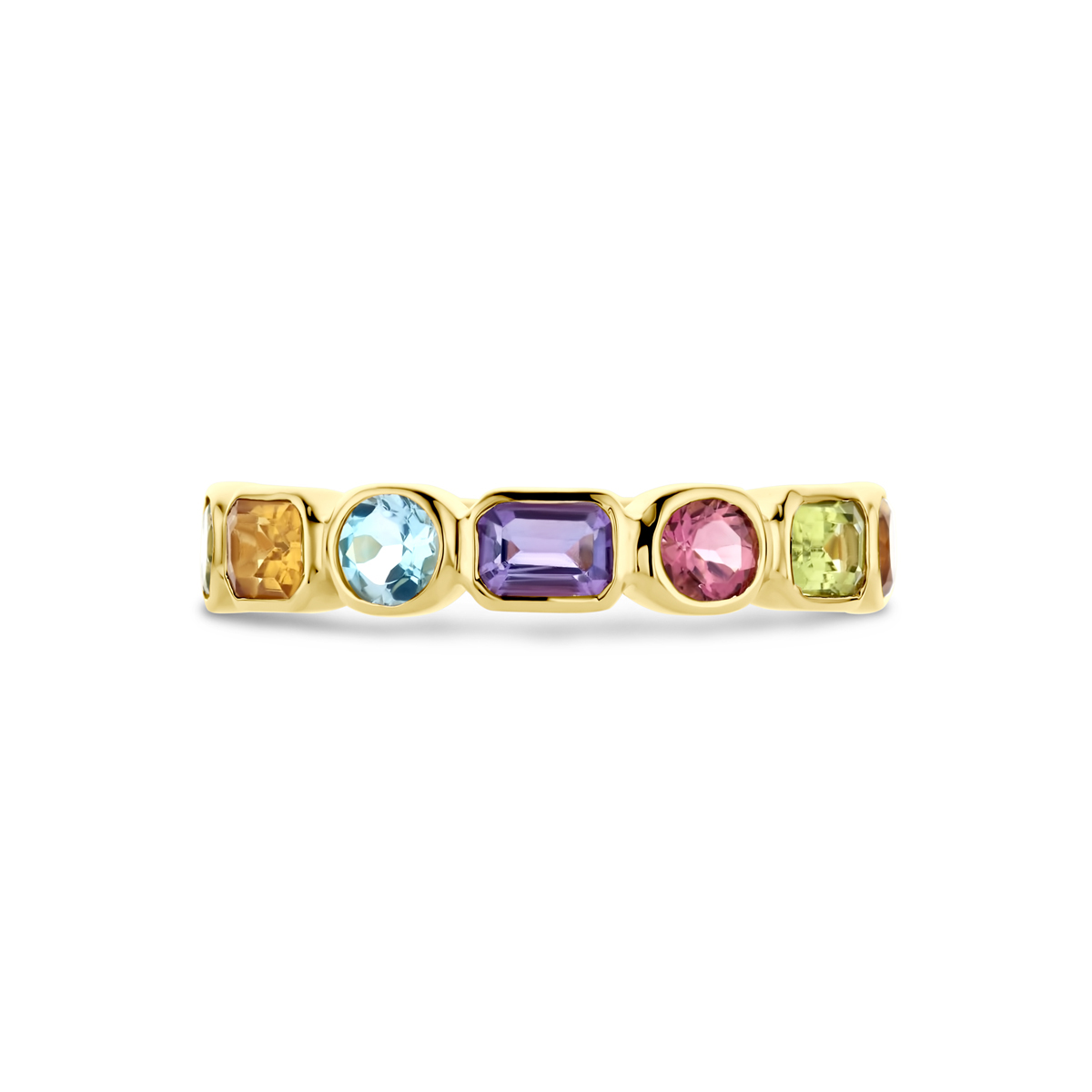 14k Geelgouden ring uitgevoerd met amethist, sky blue topaas. citrien, peridot en roze topaas. De ring heeft een breedte van ..mm.
