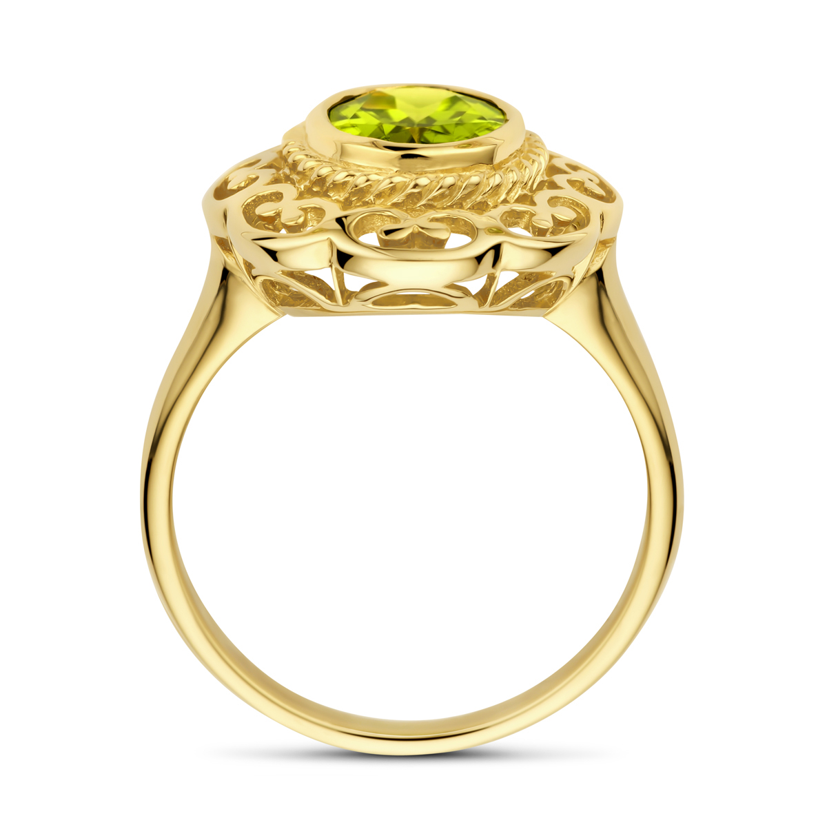 14k Geelgouden vintage ring uitgevoerd met peridot. De ring heeft een breedte van 17mm.