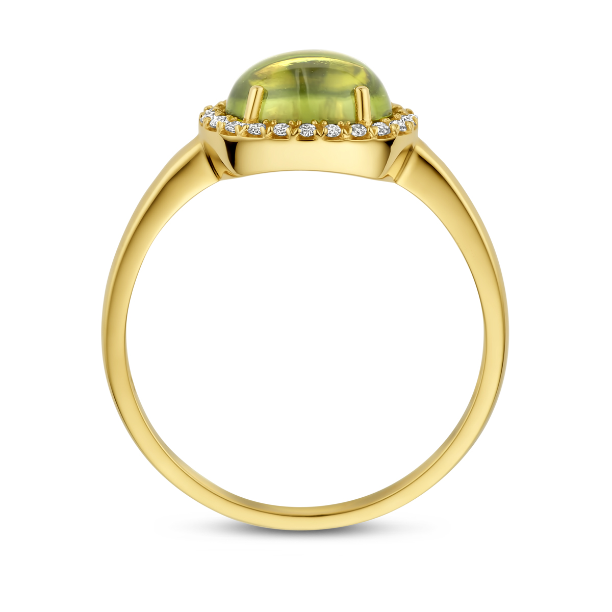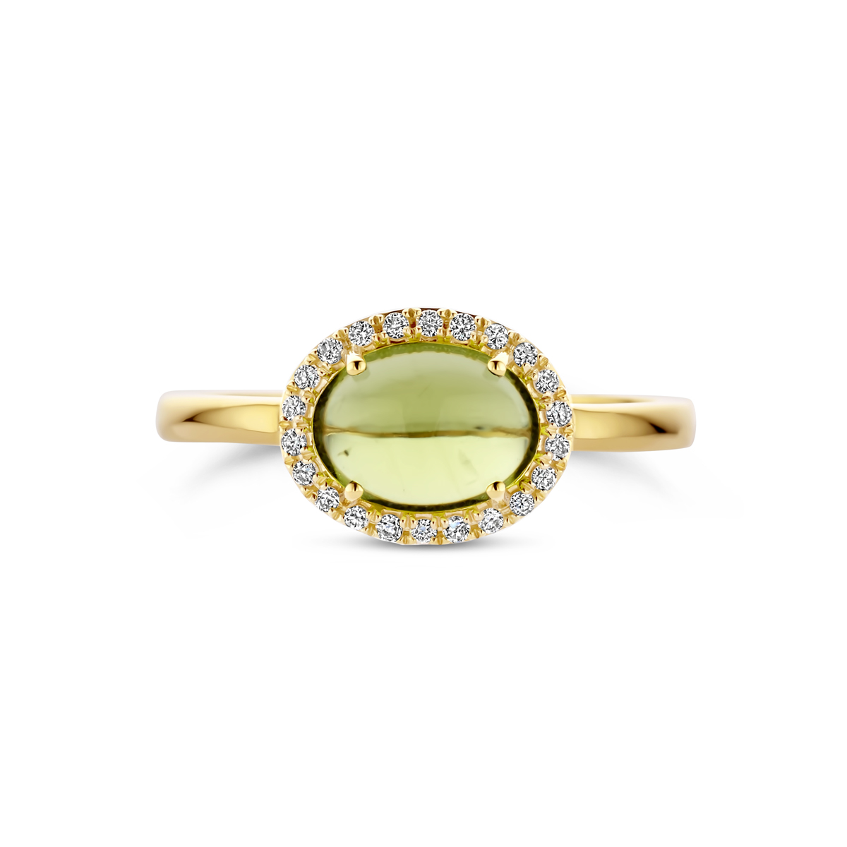 Deze prachtige geelgouden ring is voorzien van een schitterende peridot steen en 0.09ct diamanten van hoge kwaliteit (H SI). De ring is subtiel en elegant, perfect voor dagelijks gebruik of een speciale gelegenheid. Draag deze ring alleen of combineer hem met andere gouden sieraden voor een luxe uitstraling. Een tijdloos stuk dat niet mag ontbreken in jouw collectie!