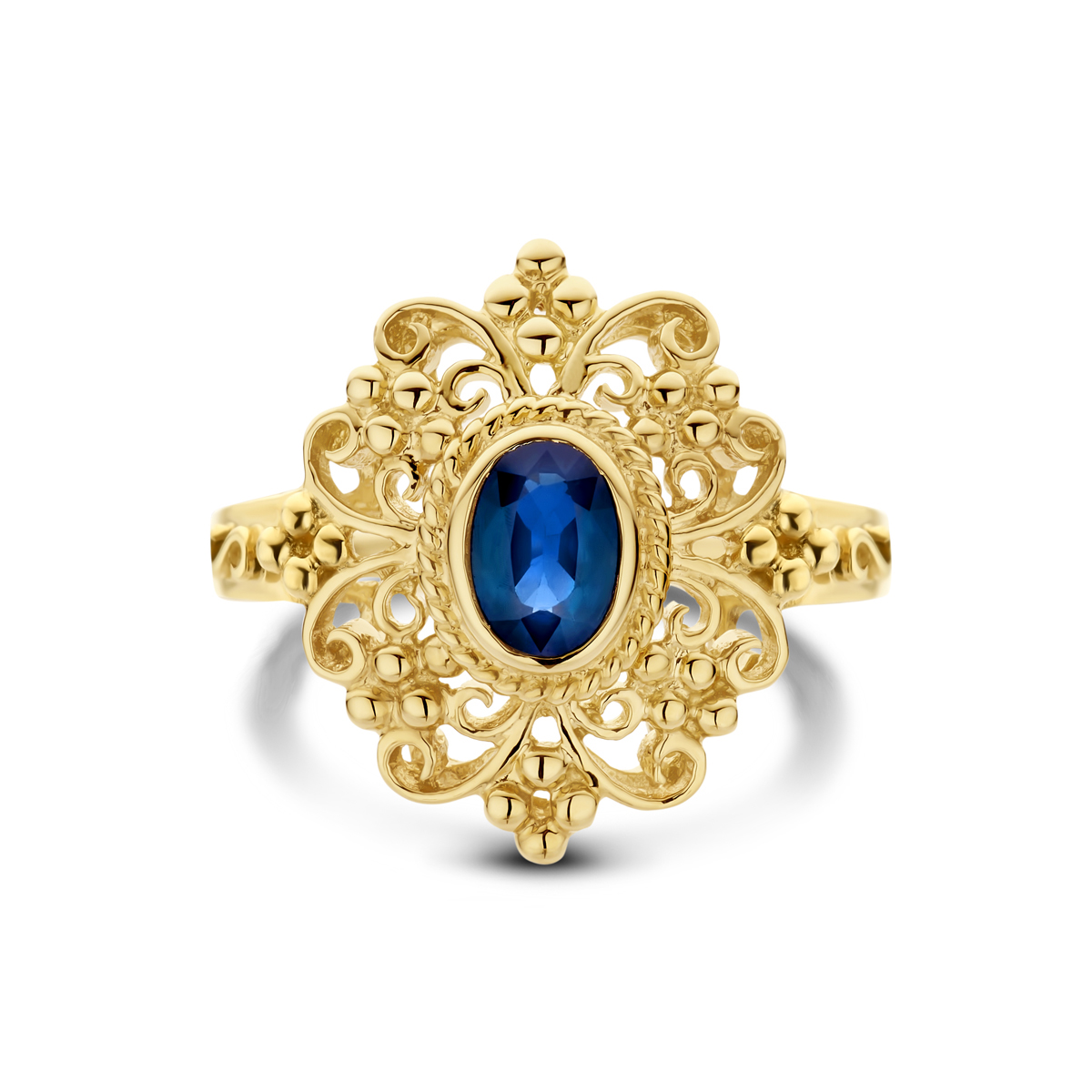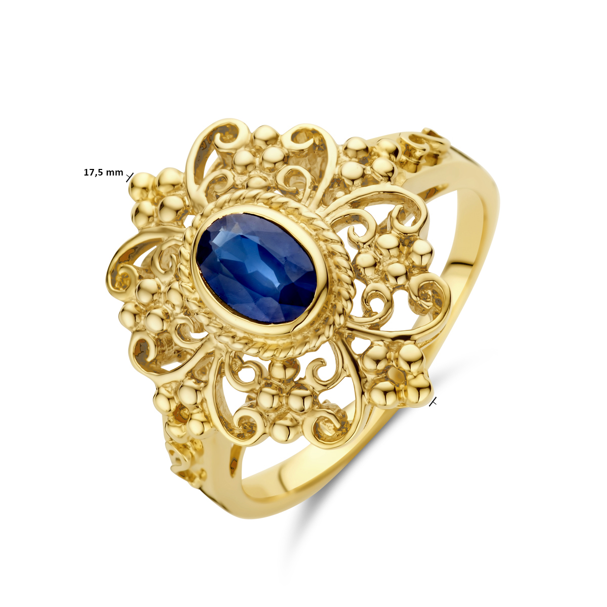 14k Geelgouden vintage ring uitgevoerd met saffier. De ring heeft een breedte van 17.5mm.