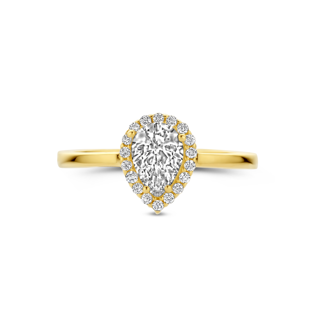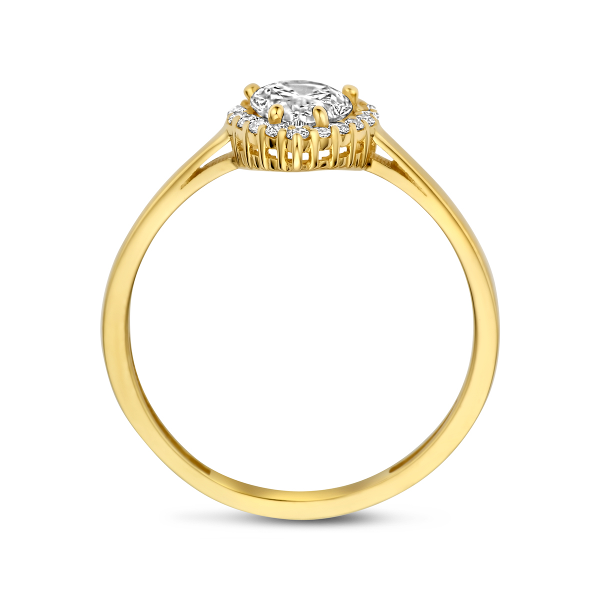 14k Geelgouden ring uitgevoerd met zirkonia. De ring heeft een breedte van 9.5mm.