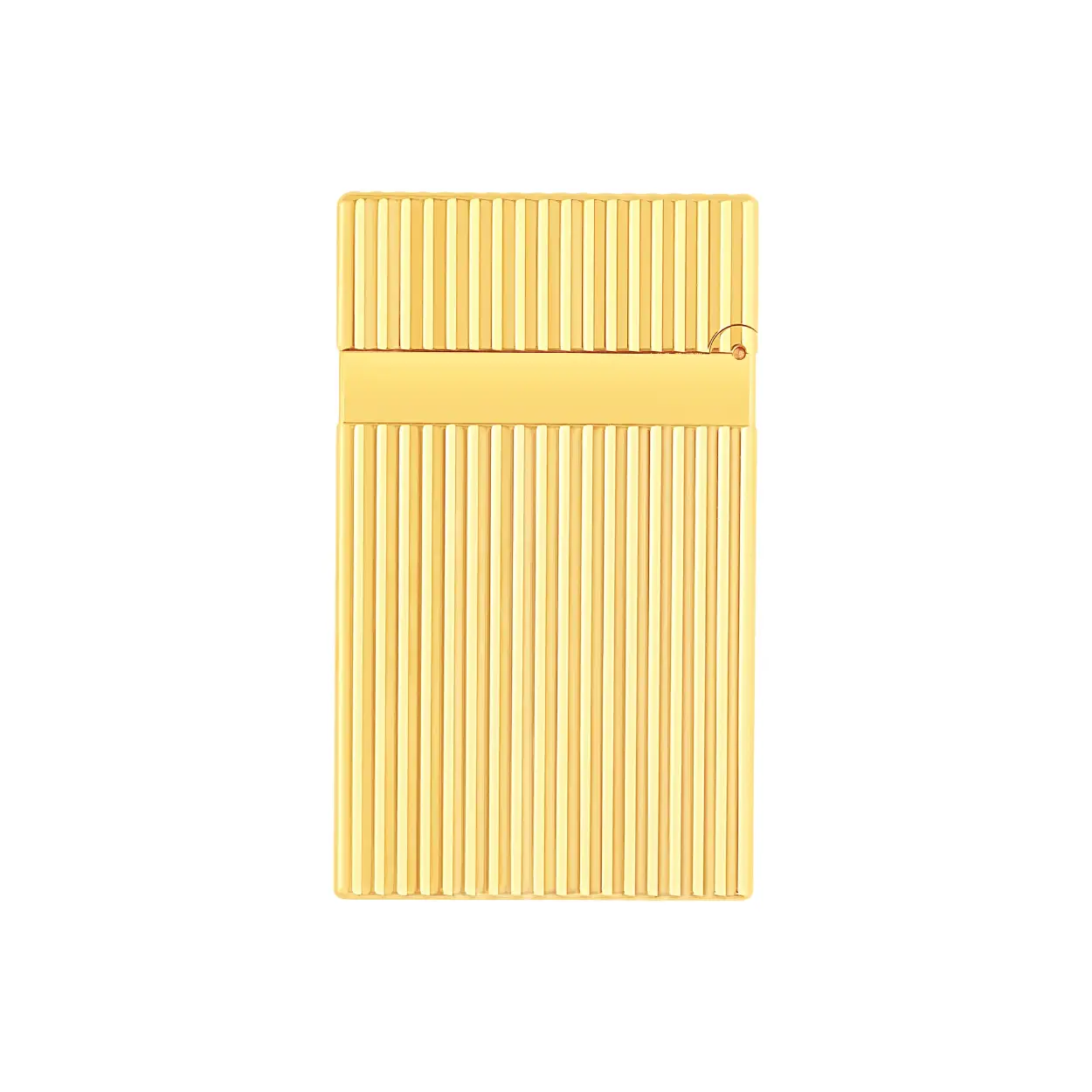 Dubbele vlam gele aansteker. Versierd met verticale guilloche en geelgouden afwerking. Met de bekende "Cling" bij het openen. Bijbehorende aanstekersteen: zwart (REF 900601). Bijbehorende gasvulling: geel (REF 900432). Aansteker geleverd zonder benzine, navulling apart verkrijgbaar.