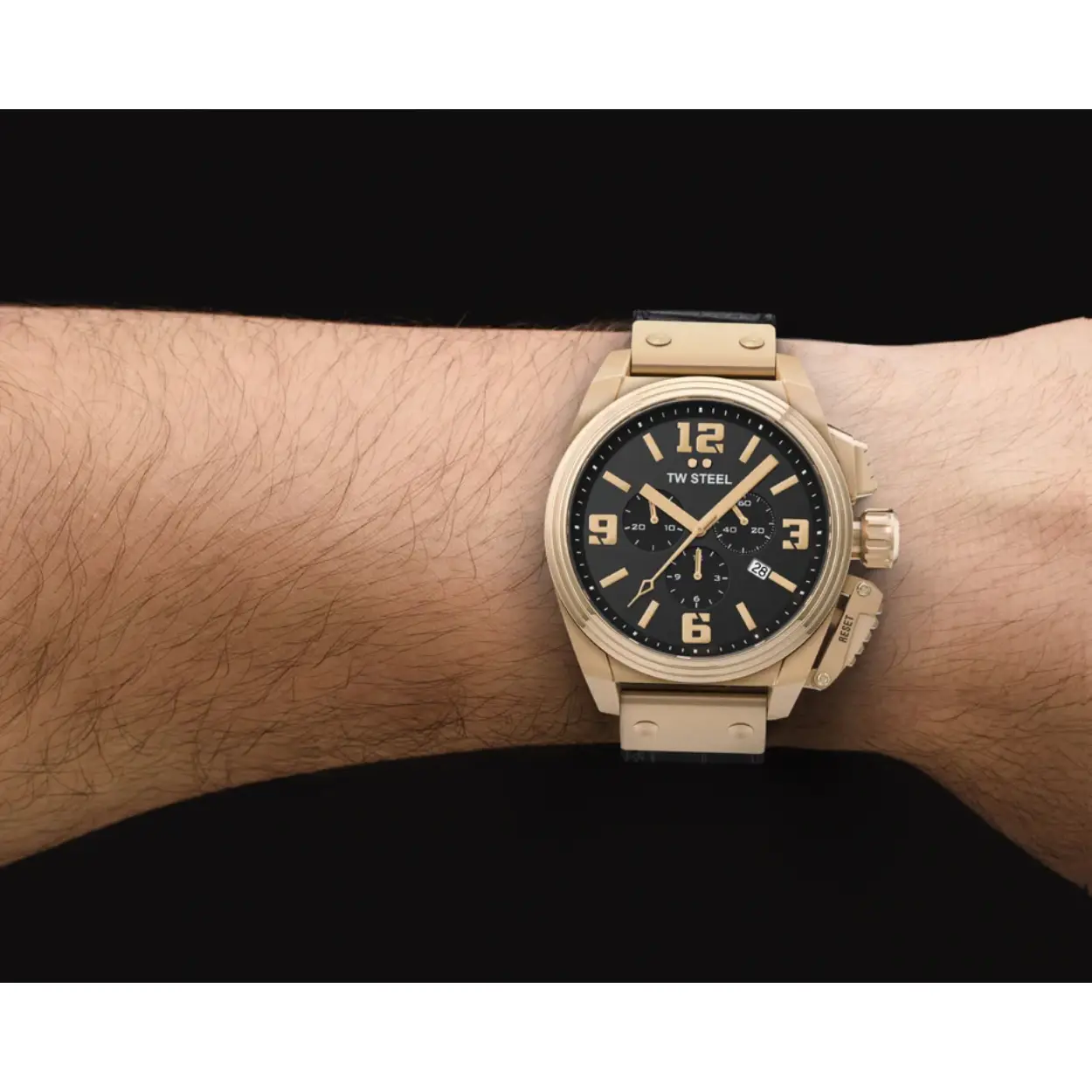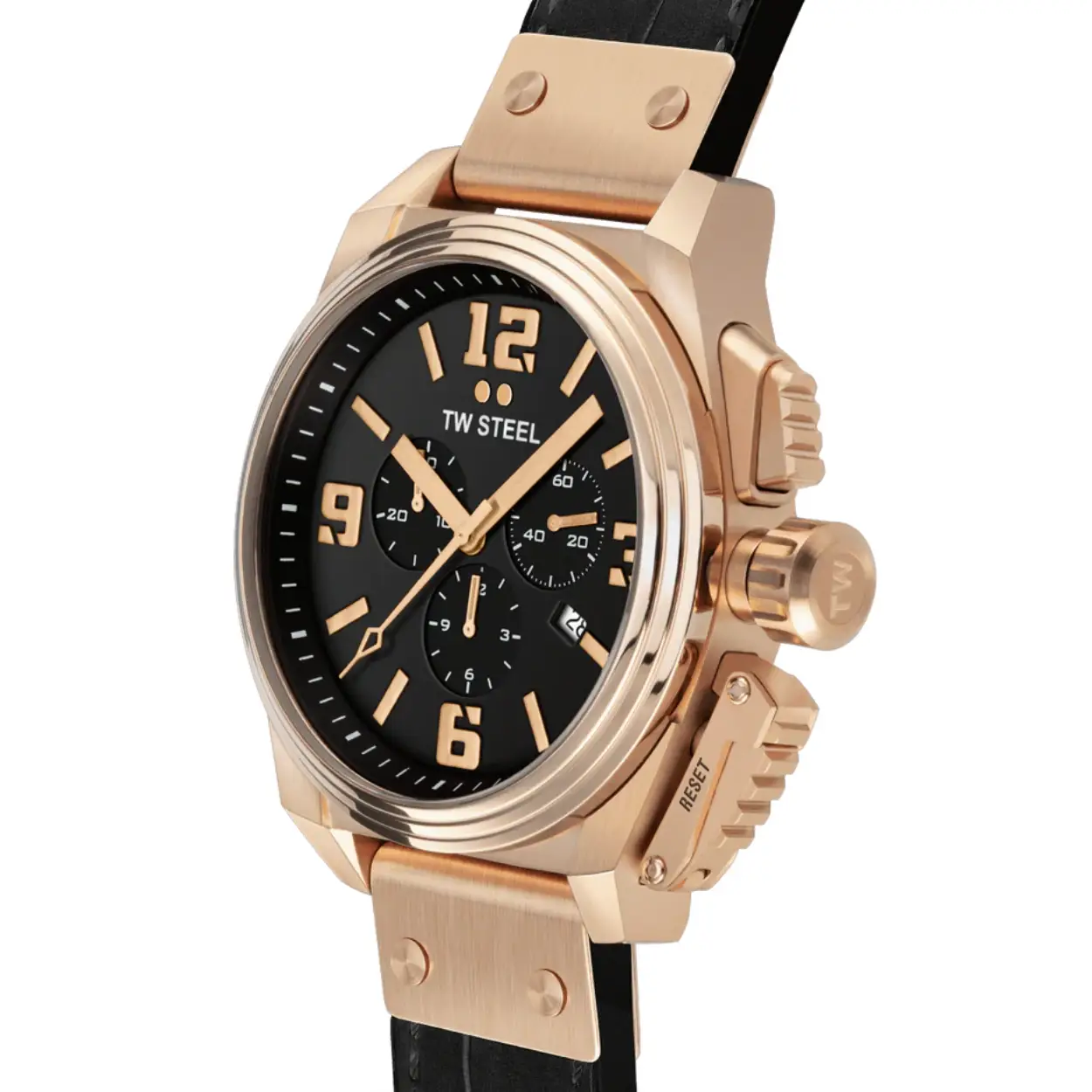 De iconische Canteen is terug! De meest populaire TW Steel collectie heeft een upgrade gekregen en is terug van nooit weggeweest.Heel herkenbaar is de TW1014 Canteen met zijn fraaie PVD rosegouden horlogekast en glanzende bezel. Dit horloge heeft een superieur Ronda 5030.D Swiss Chronograaf uurwerk dat behalve zeer accuraat ook enorm energiezuinig is.