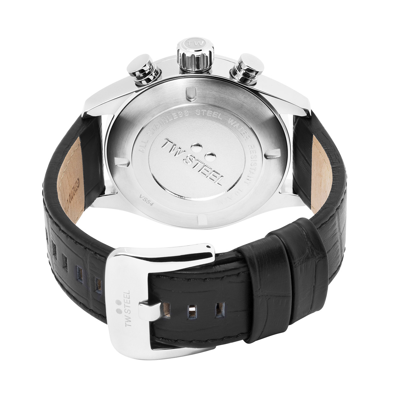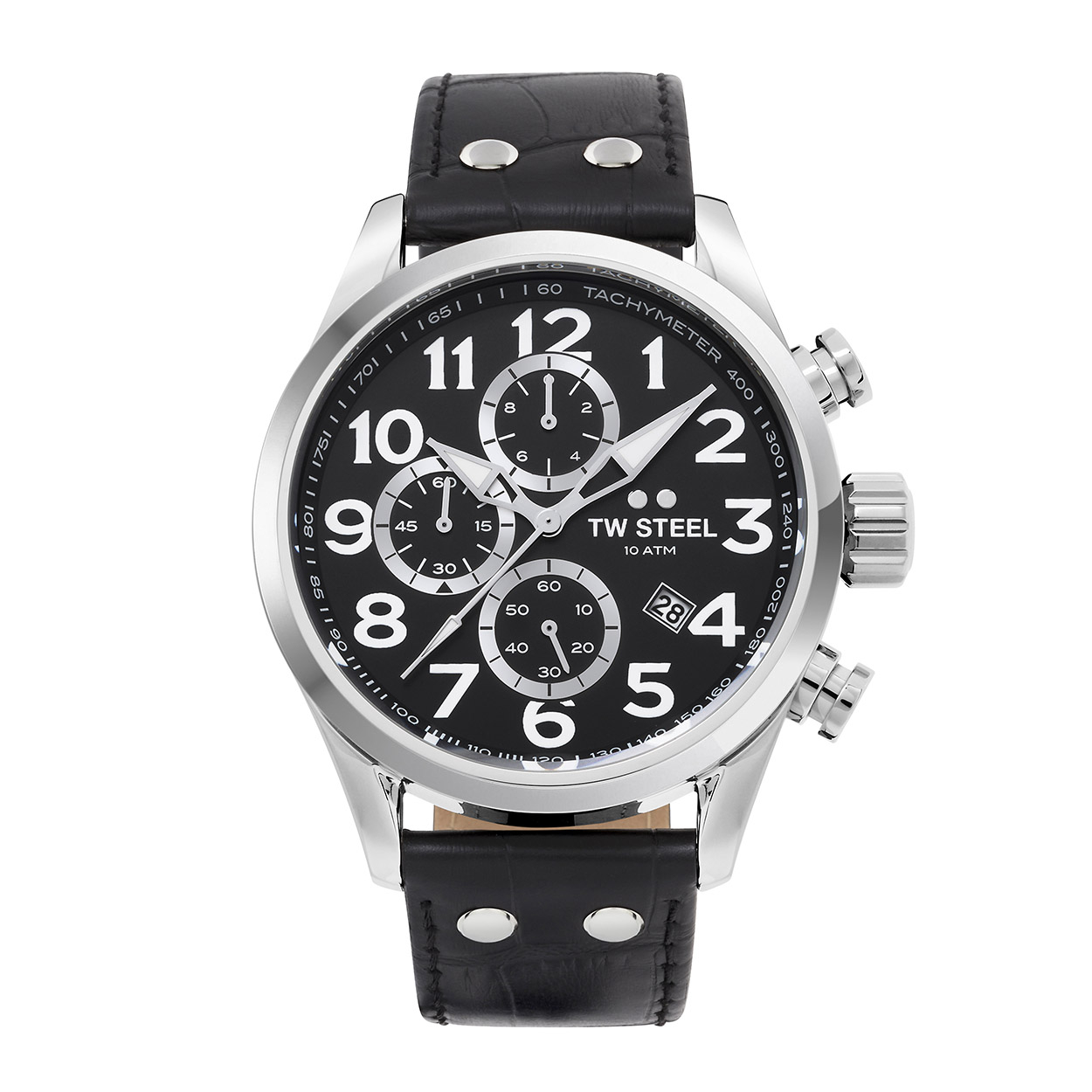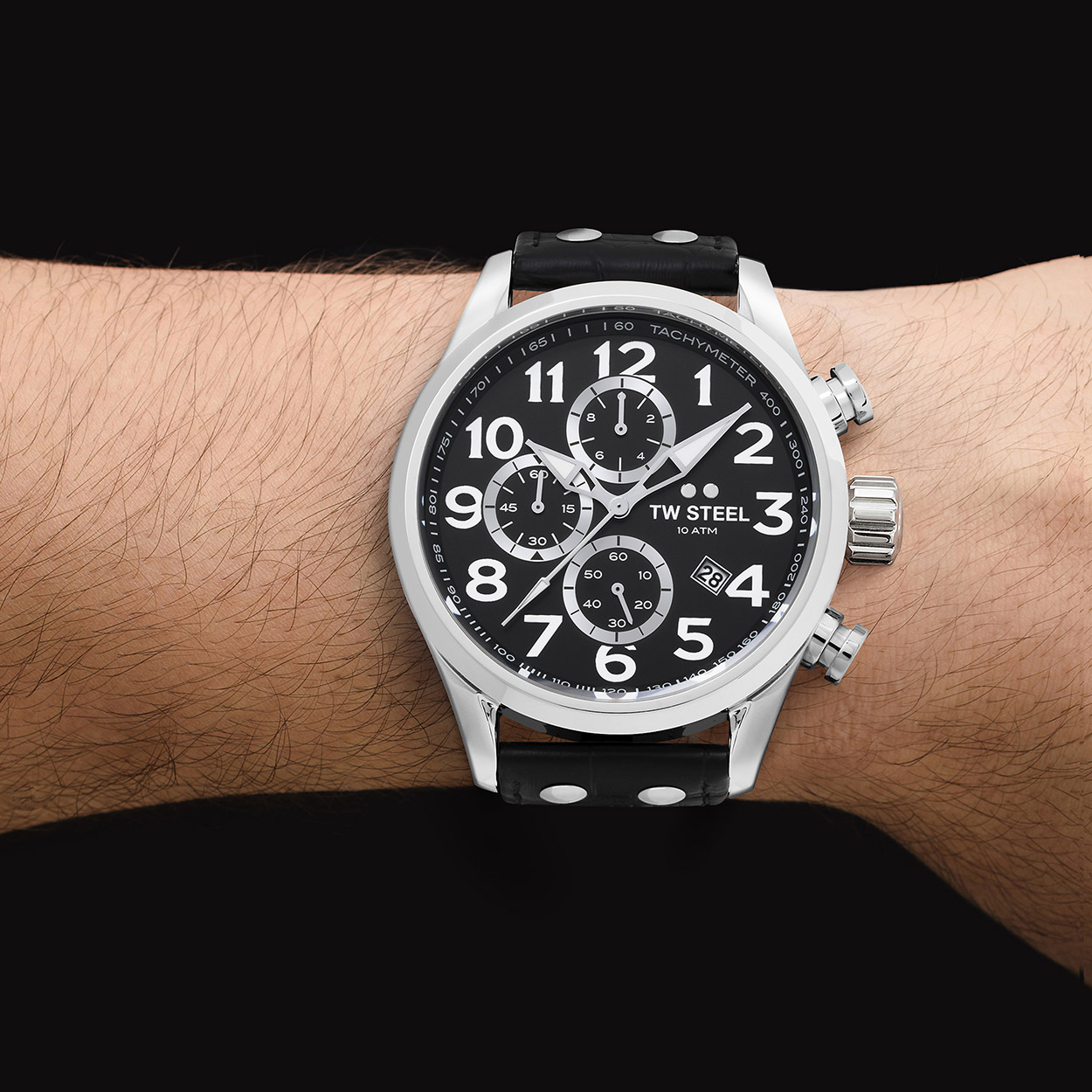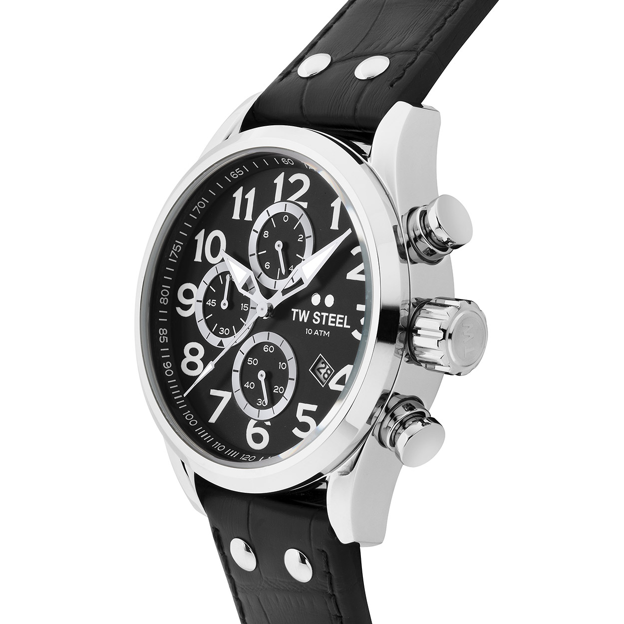 Dit Volante-model is geïnspireerd op de racewereld en heeft een 48mm stalen kast met een zwarte wijzerplaat, een chronograafuurwerk en een zwart lederen band van hoge kwaliteit.